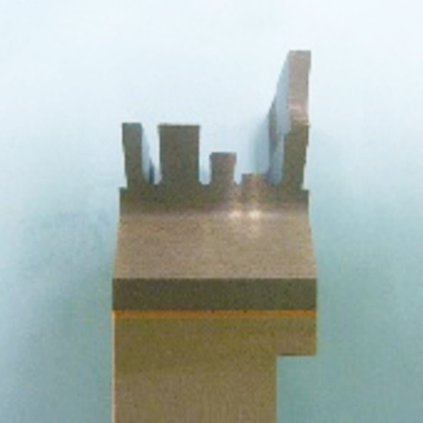写真のように、お客様の製品形状に合わせ(総型)、非常に特殊な形状をしております。型取りされた刃物で、材料を一発加工!さらに、刃物への負荷低減のため、高精度な製品加工のため、2か所のチップブレーカーが付与されています。複雑な形状に切粉形状を最適化出来る機能性の高い刃物です。