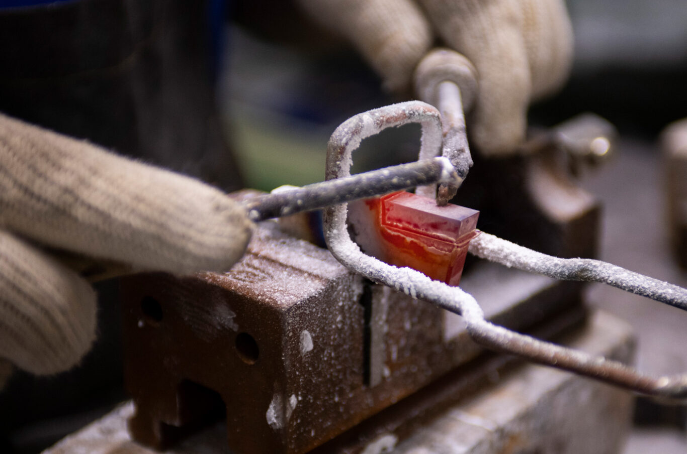 また当社では、製品によってアセチレンガスと酸素でのトーチロウ付を使い分けています。さらに硬度低下の恐れのあるハイス(高速度鋼)に関しては、ロウ付後に全数硬度検査を行う体制も構築しています。